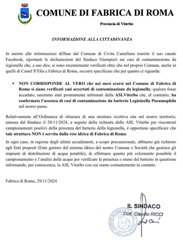 A seguito della segnalazione pervenuta dalla ASL Viterbo, con la quale si comunica l’esito positivo per legionella in campionamenti acqua della suddetta struttura ricettiva